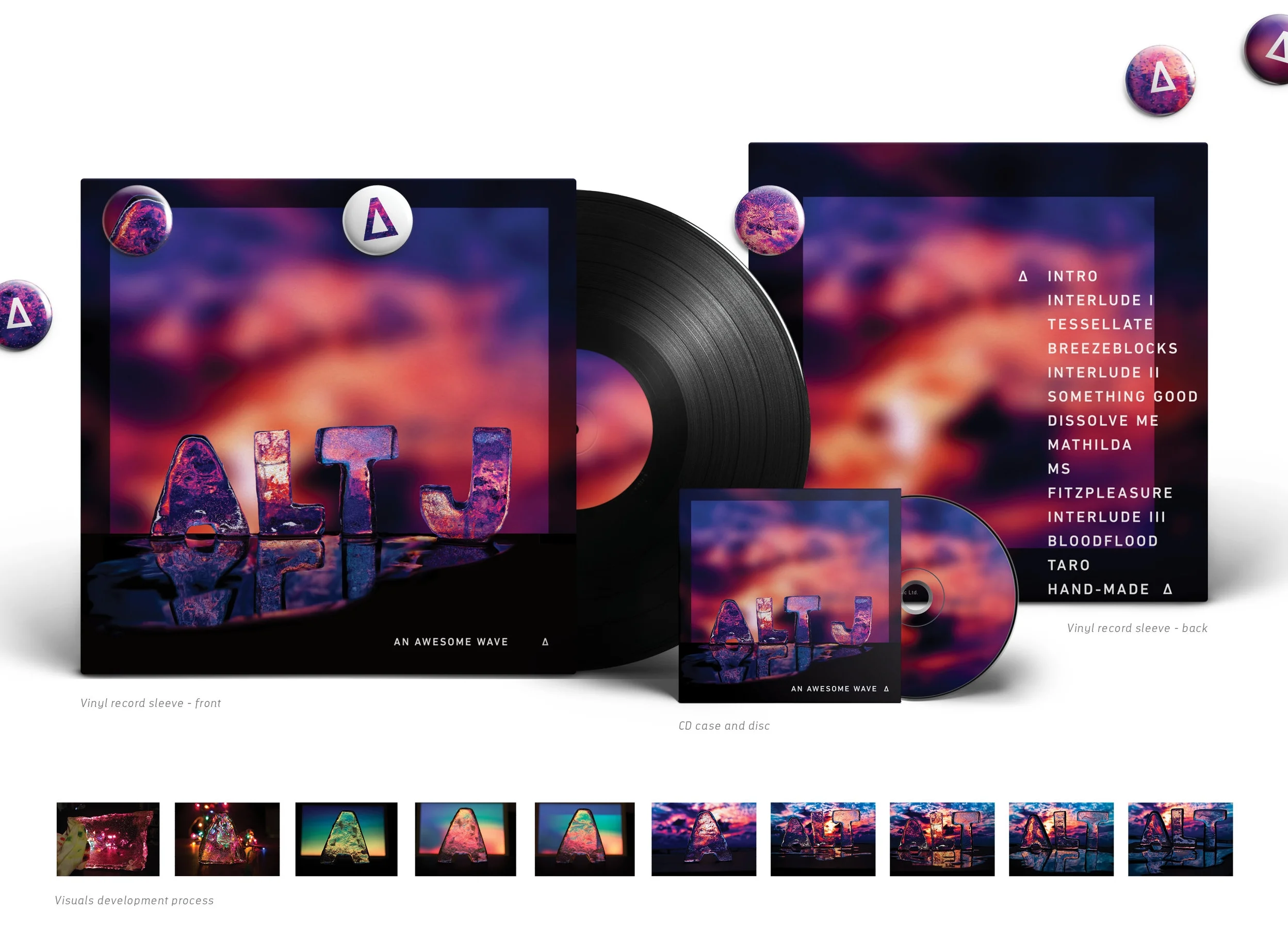 Originally a project to design a concert poster for any musical group, I reinterpreted the artwork from one of Alt-J’s singles into a new visual identity for a hypothetical special edition rerelease of their 2012 album, An Awesome Wave. The physical typography was created by carving and photographing blocks of ice in front of a luminous sunset background.